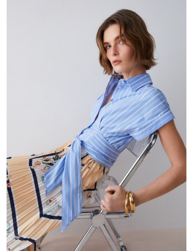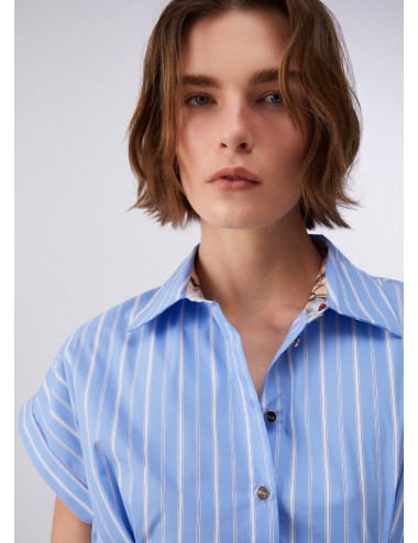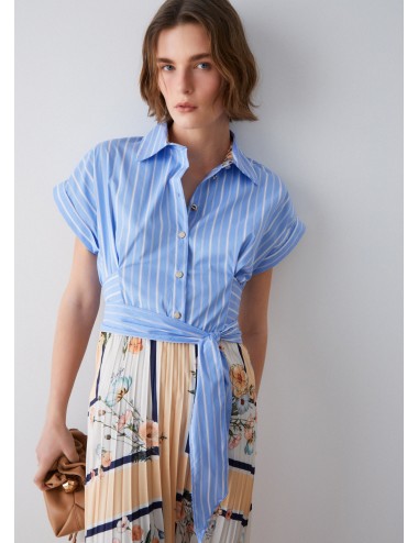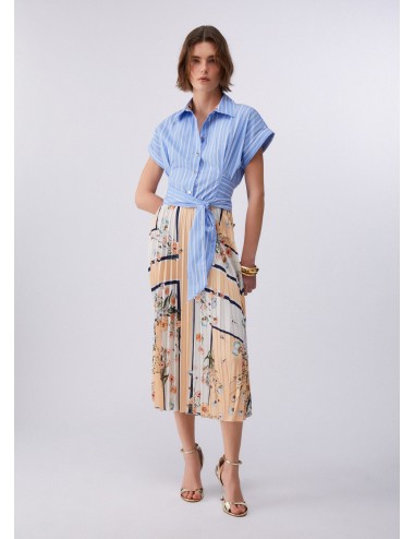 Righe azzurre essenziali, un plissé dalle sfumature pesca. Tra fiori delicati e cornici grafiche, quest'abito è pronto a completare i tuoi look di stagione con morse a mano e sandali gold.