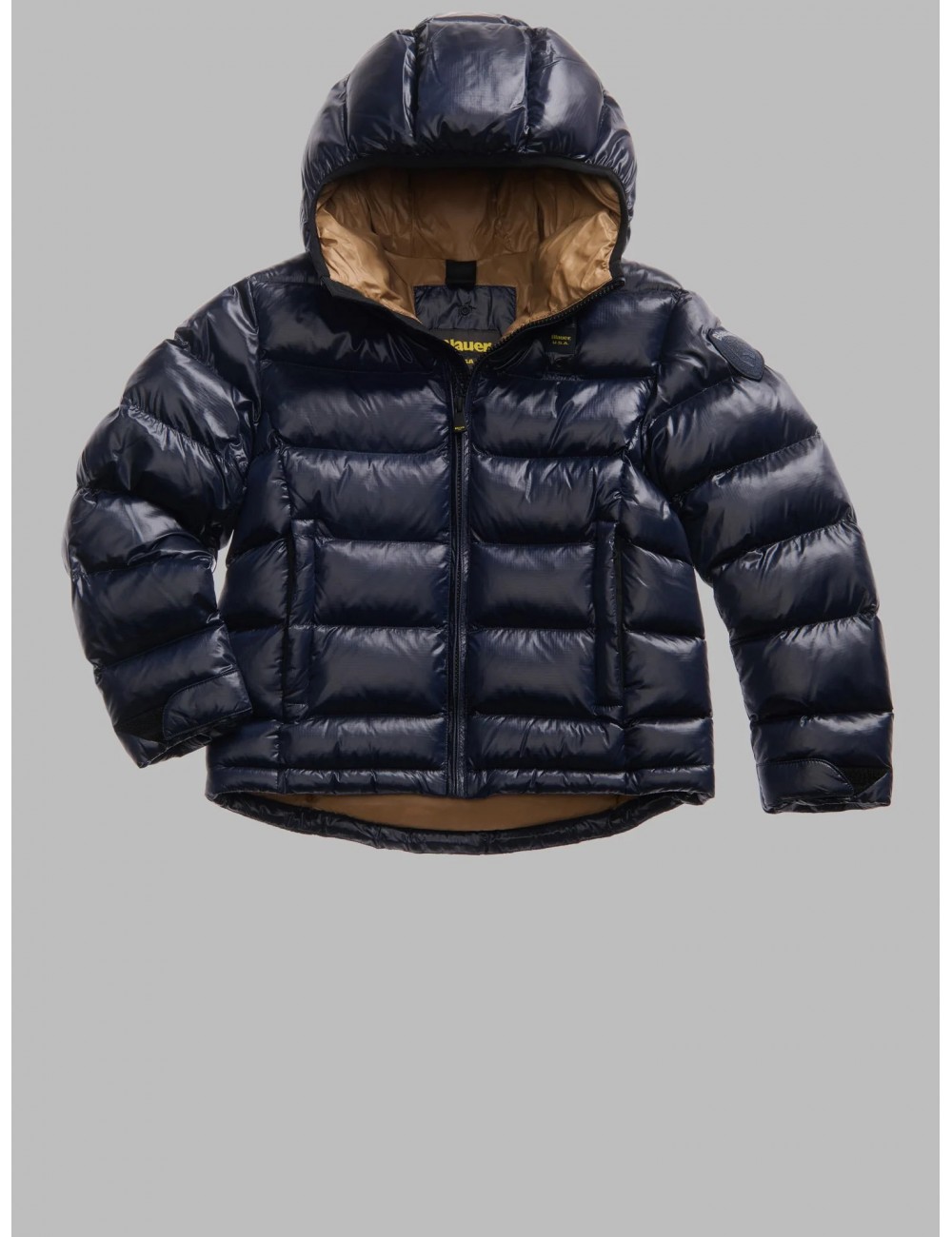 Piumino bambino in nylon dall’effetto quadrettato e impunturato a righe orizzontali. Capo iconico Blauer con imbottitura ecologica.