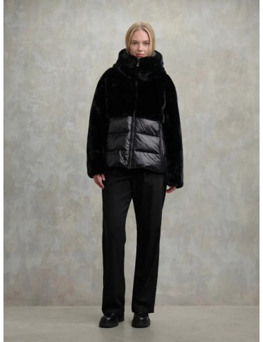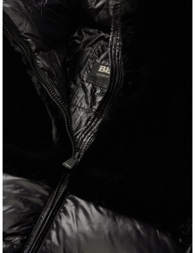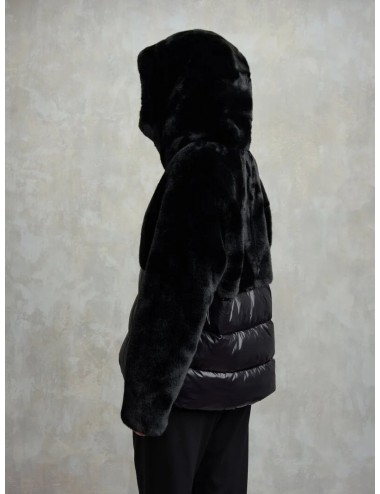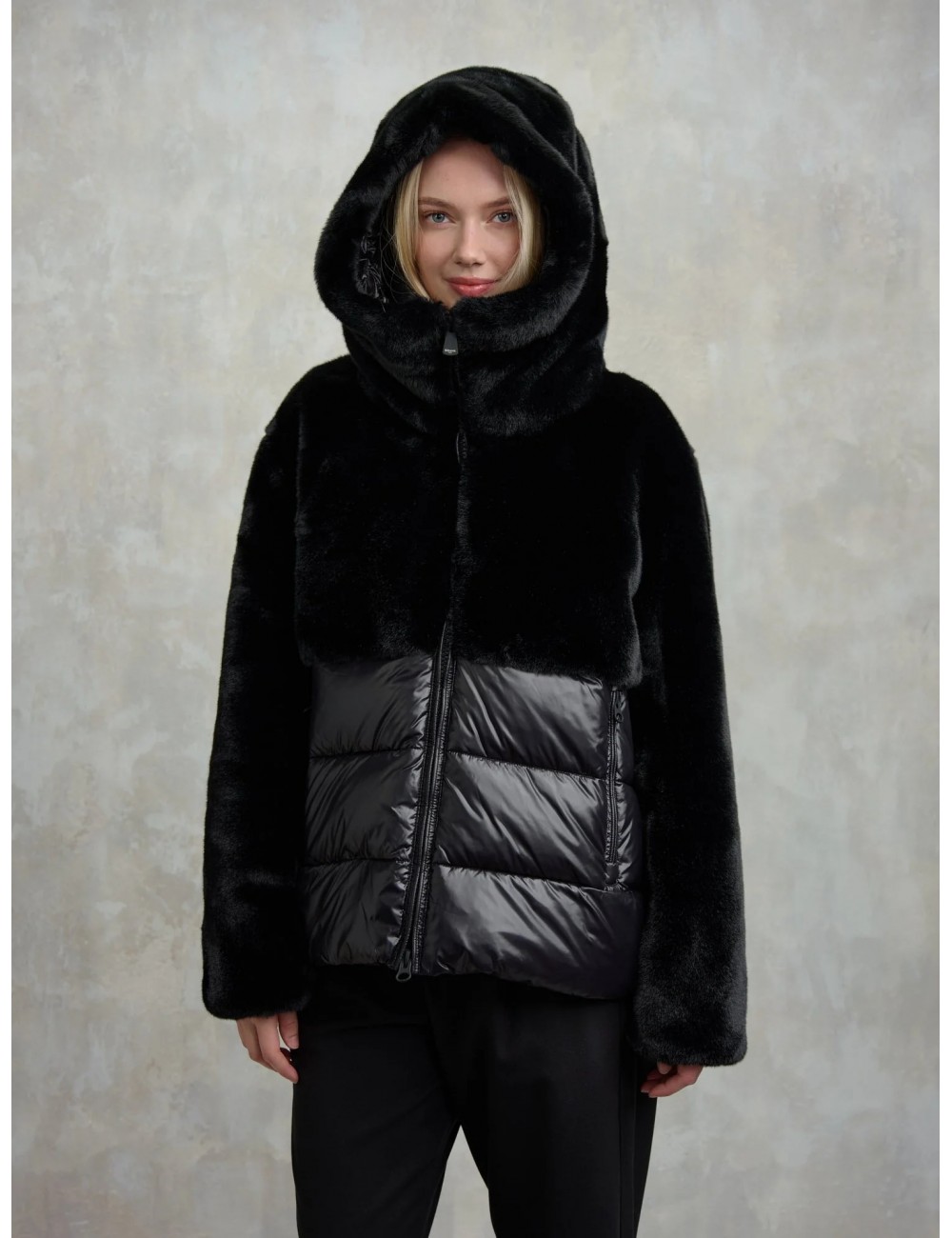 Giubbetto in ecopelliccia nella parte superiore e in nylon lucido nella parte inferiore. Caldo cappuccio ed impuntura sotto a righe orizzontali; capo pensato per proteggere dagli inverni più rigidi senza rinunciare allo stile.