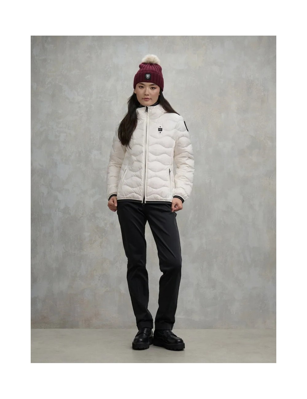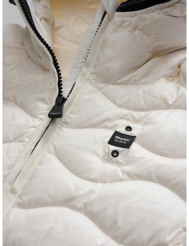 Piumino idrorepellente trapuntato ad onde orizzontali dal taglio svasato. Capo iconico Blauer con imbottitura naturale, calda e non ingombrante.