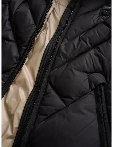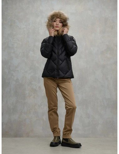 Piumino idrorepellente trapuntato a linee geometriche. Piumino sfiancato per donare risalto al punto vita.