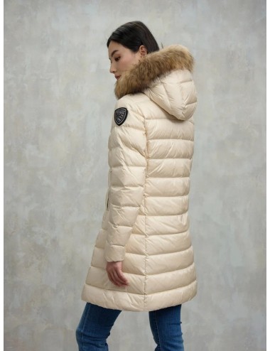 Piumino lucido lungo trapuntato a righe orizzontali con cappuccio fisso, bordo in pelliccia removibile ed interno in contrasto colore. Capo donna con colori fashion e dal taglio che risalta il punto vita.