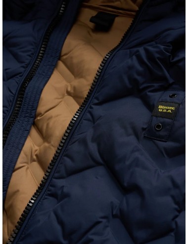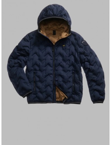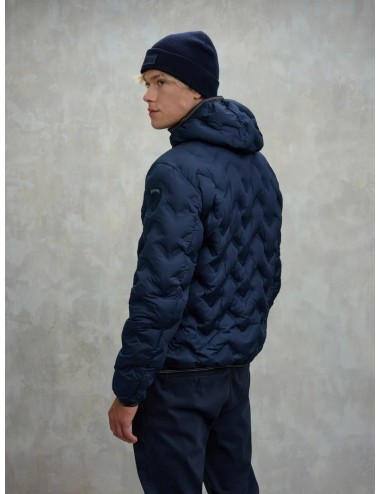 Piumino con cappuccio fisso e profilo dall’aspetto aderente e increspato. Cuciture nastrate ad angoli che dona un tocco innovativo e dinamico.