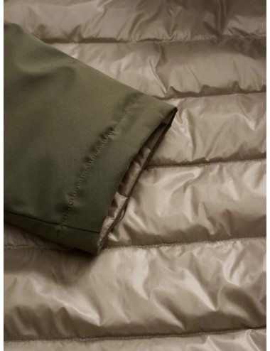 Piumino idrorepellente reversibile liscio da un lato e trapuntato a righe orizzontali dall’altro. Capo versatile da utilizzare in due versioni una più elegante e una più casual.