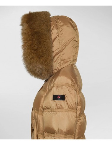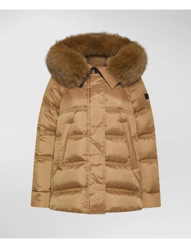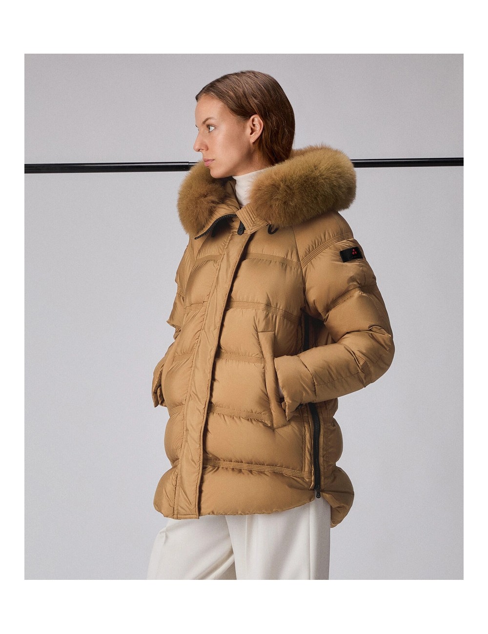 Puffer jacket ad ampie trapunte, in tessuto super-light in 100% poliestere riciclato da materiali post consumo, dalla mano morbida e dalla struttura super compatta. L’imbottitura in piuma d’oca certificata assicura calore elevato e leggerezza, mentre il trattamento idrorepellente PFC Free protegge senza l’uso di sostanze chimiche nocive. Di gusto urban sportswear, la shape ad A è regolabile grazie all’apertura delle zip laterali, mentre il cappuccio fisso è arricchito da un bordo in pelliccia di volpe staccabile in tono colore. Completano il modello le tasche a filetto, la chiusura con patta e bottoni che nasconde una zip a doppio cursore. Il modello, bestseller della collezione invernale di Peuterey, ora nei colori trend della stagione, può essere indossato anche in occasioni eleganti e mondane.