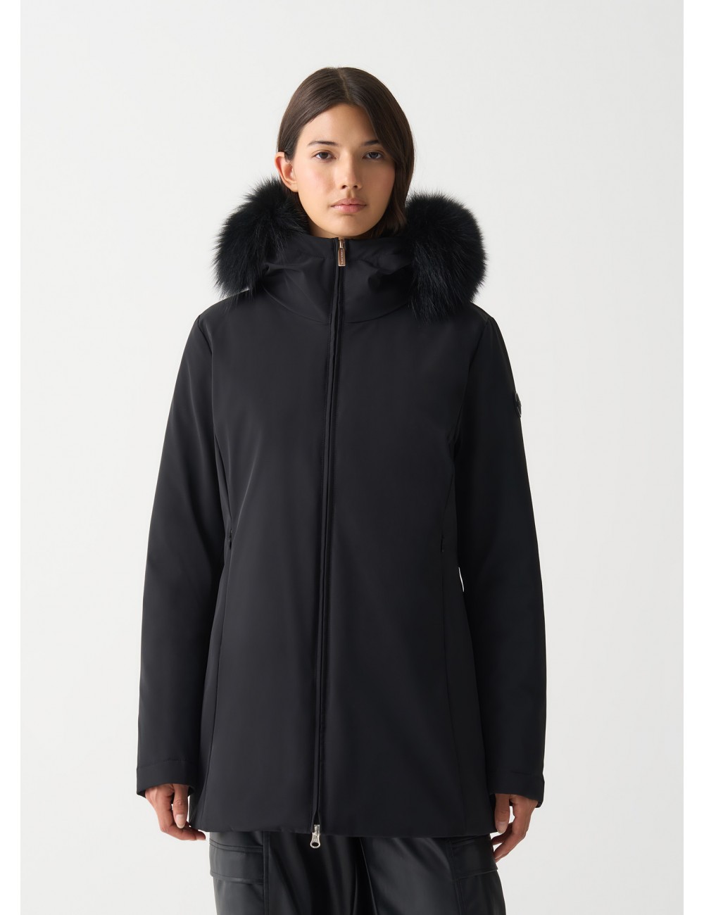 Progettata per offrire la massima protezione in inverno grazie alla sua impermeabilità, senza rinunciare a uno stile romantico e femminile, questa giacca in piuma unisce armonia e funzionalità. Il cappuccio con pelliccia sintetica e le tasche laterali con zip aggiungono dettagli distintivi, mentre il tessuto stretch assicura un comfort ottimale in ogni movimento.