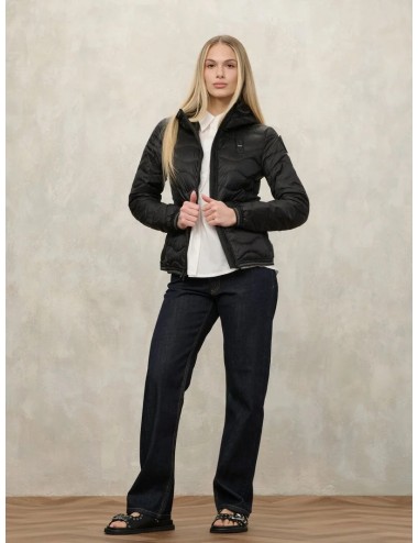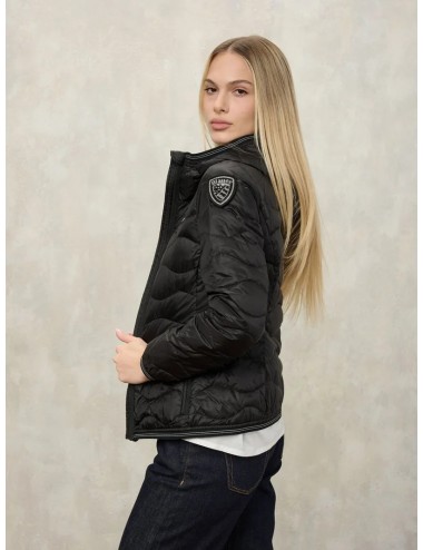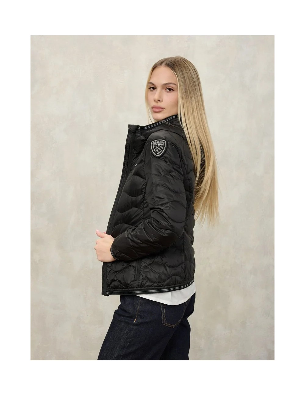 Piumino con cuciture ad onde orizzontali con fodera in tono. Imbottitura leggera in morbida piuma e taglio svasato per risaltare la figura.