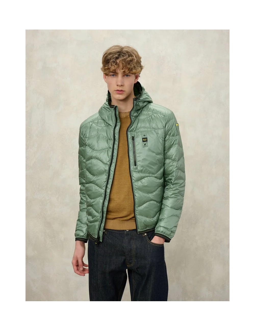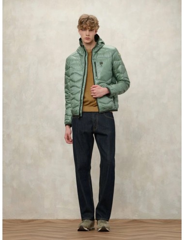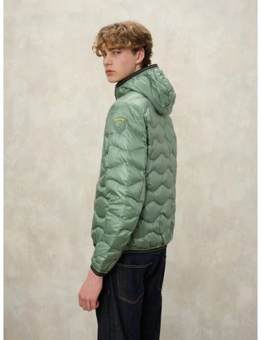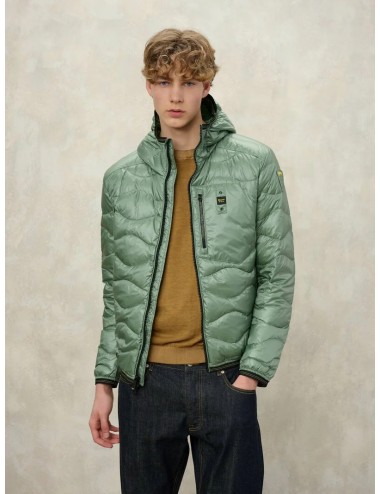 Piumino lucido imbottito piuma e impunturato ad onde orizzontali. Piumino con cappuccio e tasca sul petto per aumentare la praticità al capo iconico della linea.