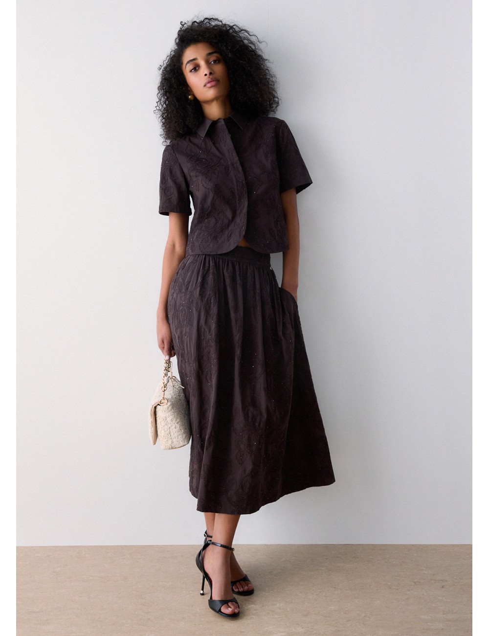 La gonna che rende speciale il quotidiano. In mussola di cotone, fresca e traspirante, ha una linea midi ampia e una vita elasticizzata per un fit comodo. I ricami tono su tono completano il design con un tocco raffinato. Perfetta per città, vacanze e weekend fuori porta, con sneakers di giorno e con sandali la sera.