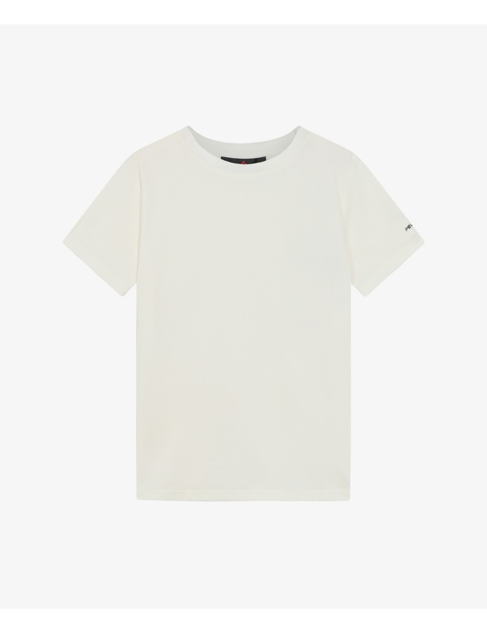 T-shirt in piquet stretch di cotone, poliestere e seta, tinto in pezza, con logo ricamato sulla manica sinistra. Il tessuto morbido, leggero e traspirante la rende perfetta per affrontare la bella stagione con stile e comfort. Un modello moderno e versatile, ideale come capo base nel guardaroba estivo dei più piccoli.